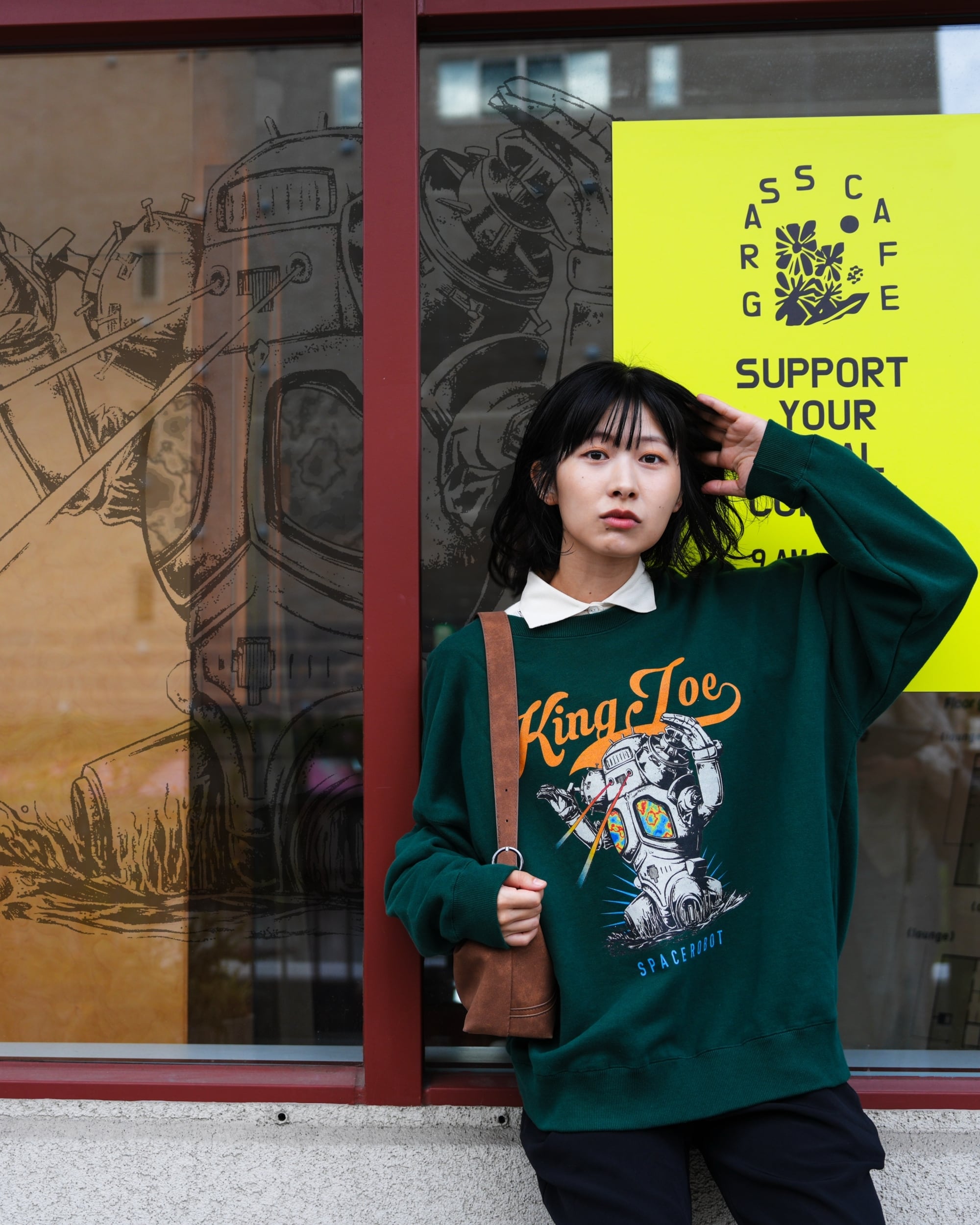 着丈に対して身幅が極端に広いボックスシルエットのトレーナーは、10オンスのほどよい重さでデイリーユースに向いた1着です。アイビーグリーンのPOPなトレーナーに映える、アメリカンカジュアルなキングジョーのアートはインパクト大です。