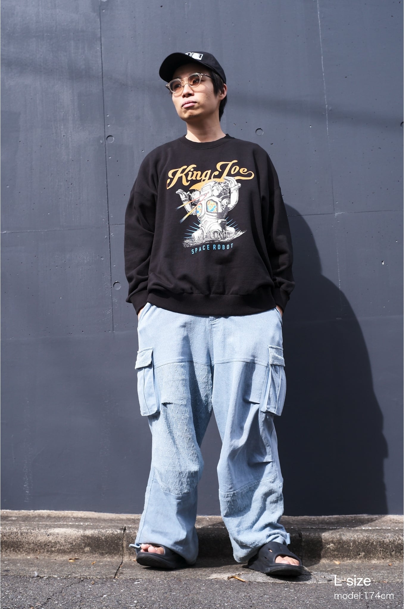 着丈に対して身幅が極端に広いボックスシルエットのトレーナーは、10オンスのほどよい重さでデイリーユースに向いた1着です。シックなブラックとアメリカンカジュアルなキングジョーのアートの彩りはインパクト大です。