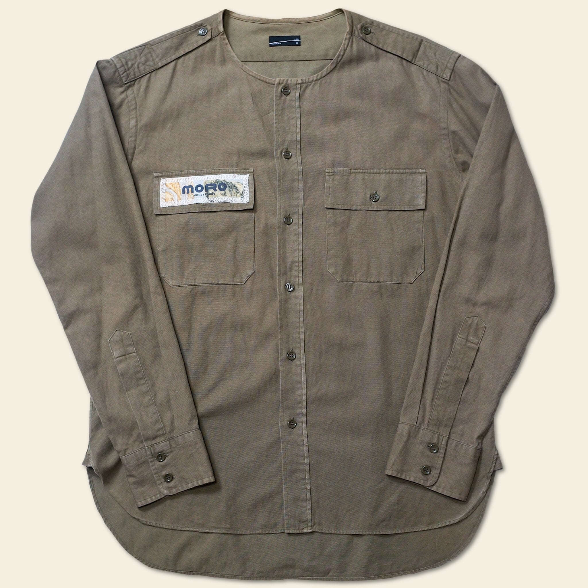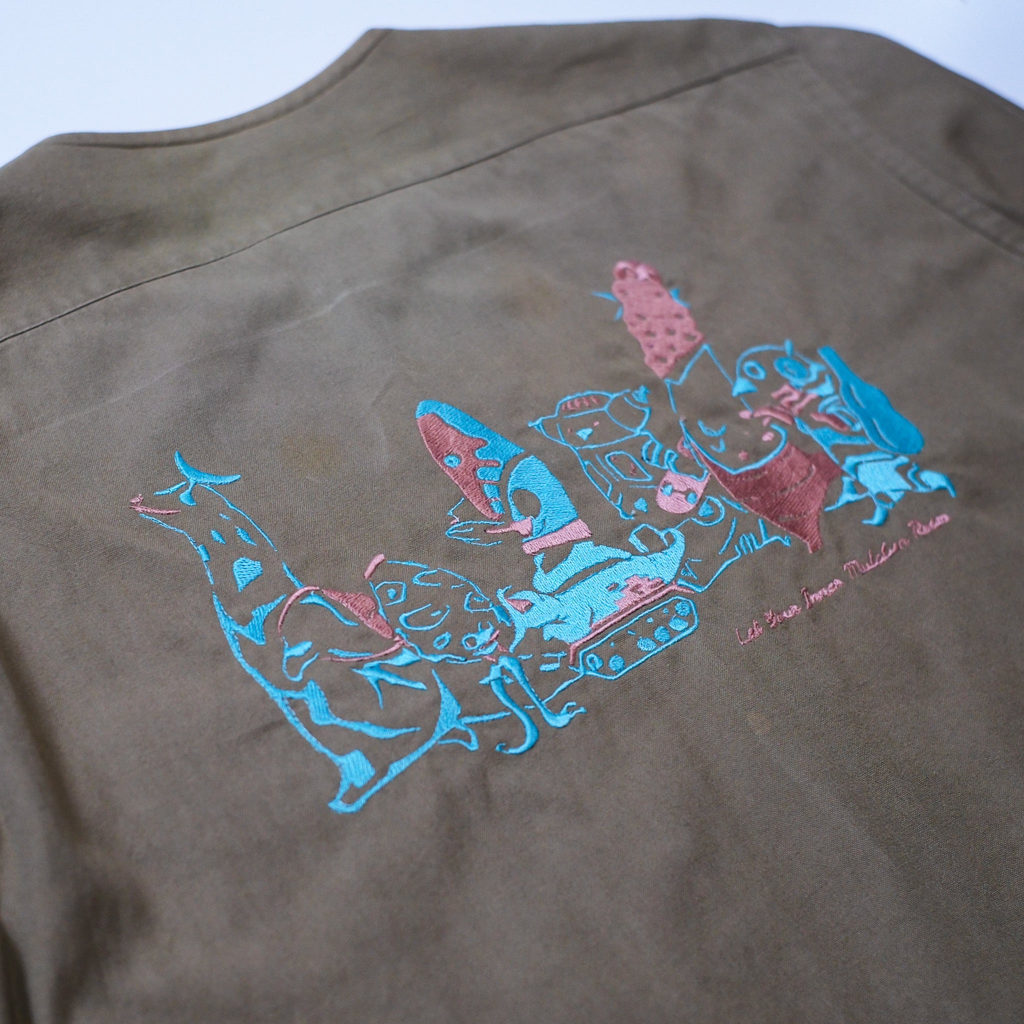 メジャーブランドの良質なノーカラーシャツは使い勝手が抜群です。少しくすんだカーキに合わせ、刺繍糸もくすんだ中間色にまとめました。胸元のフラップポケットや裾のラウンド感など、ボディも魅力と刺繍のエネルギーが交差する上質な1着です。