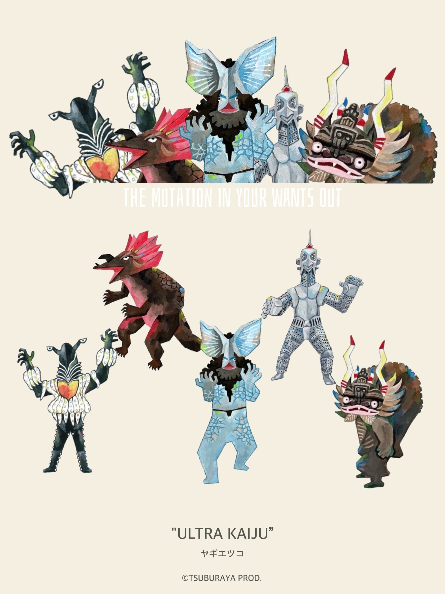 ヤギエツコ 氏のアートは、ウルトラ怪獣をどこかレトロかつユーモア溢れるタッチの仕上がりです。ブランドデザイナーの岩男がデザインしたテキストアートは、遊び心を持ちながら彩りある日々を過ごして欲しいという思いが込められています。