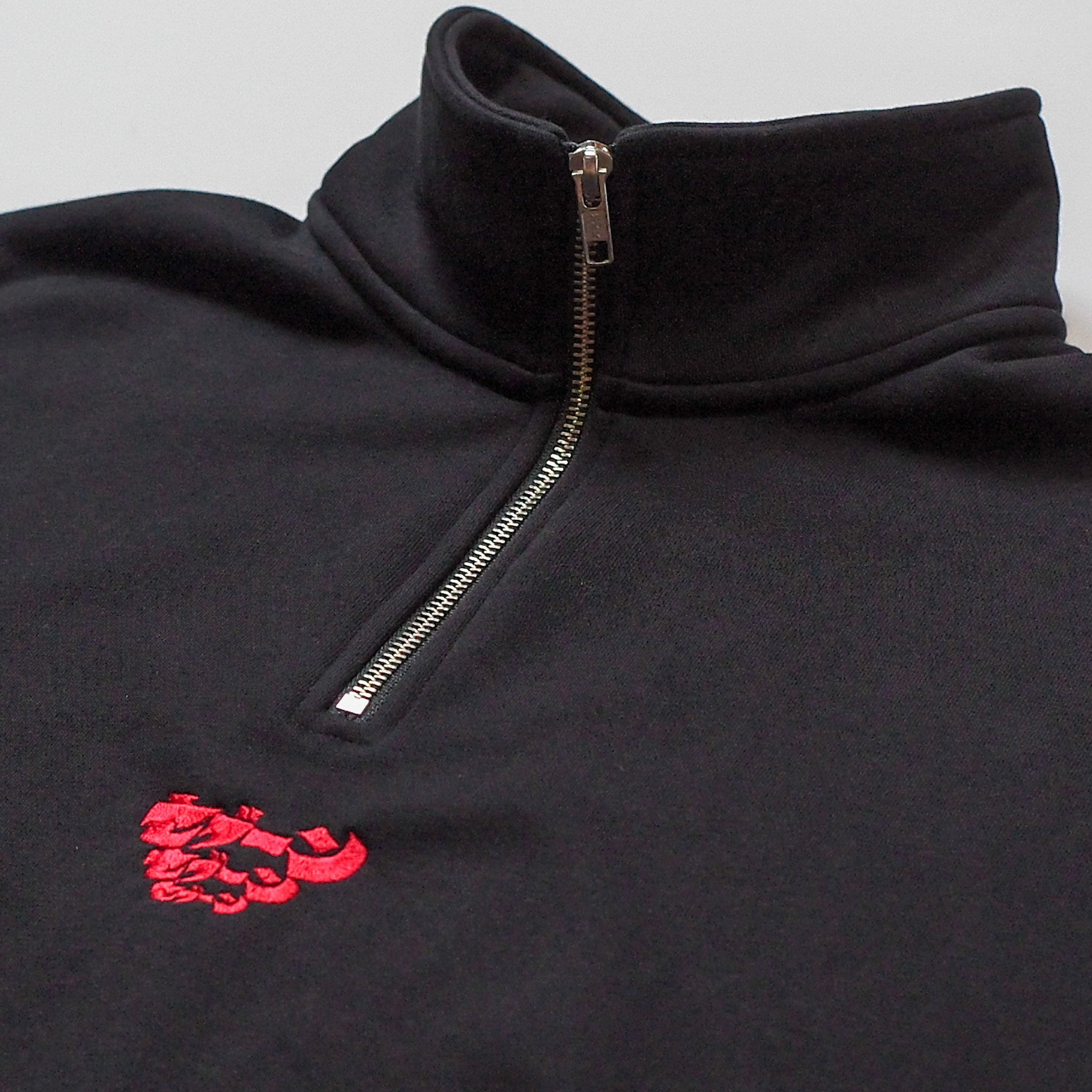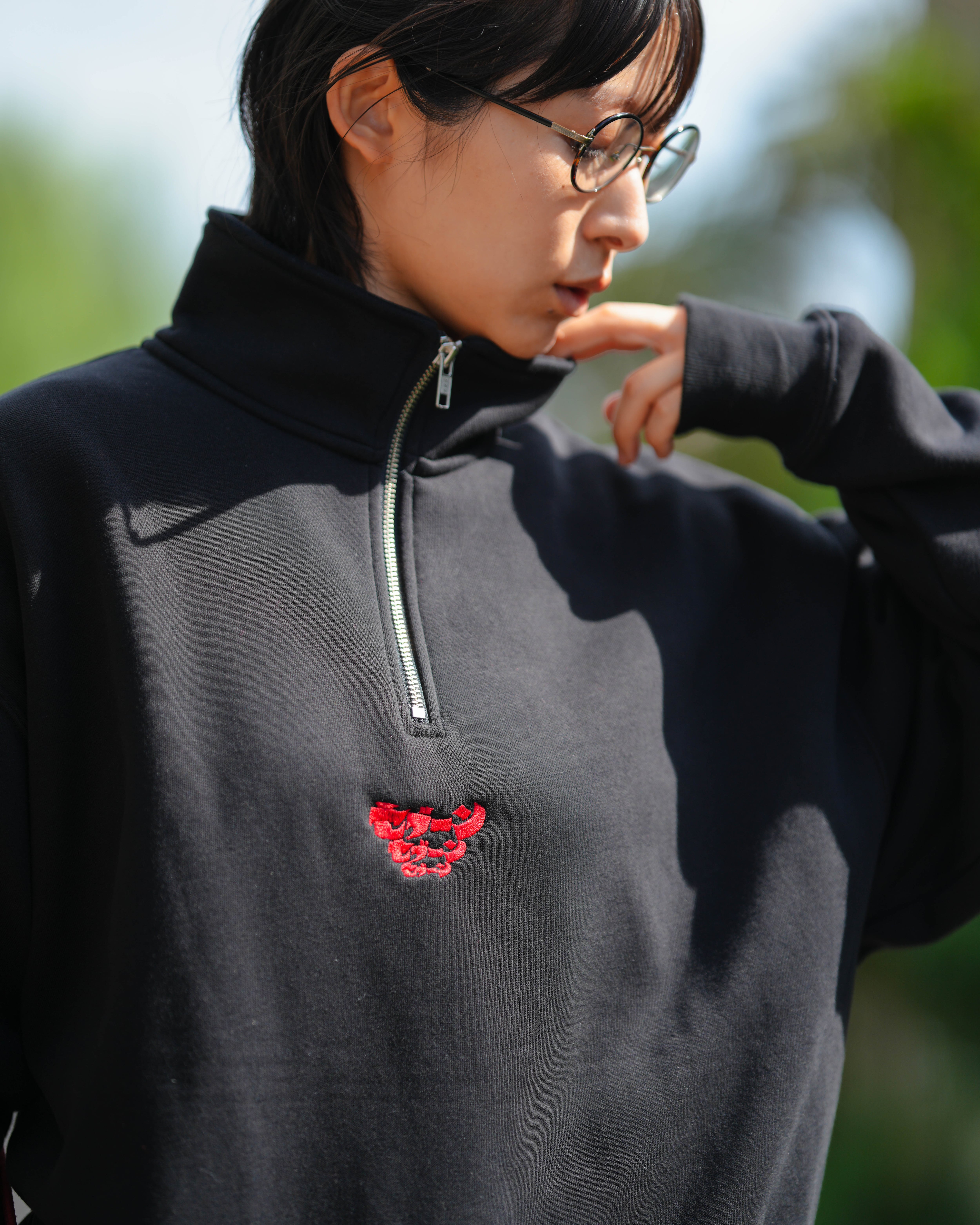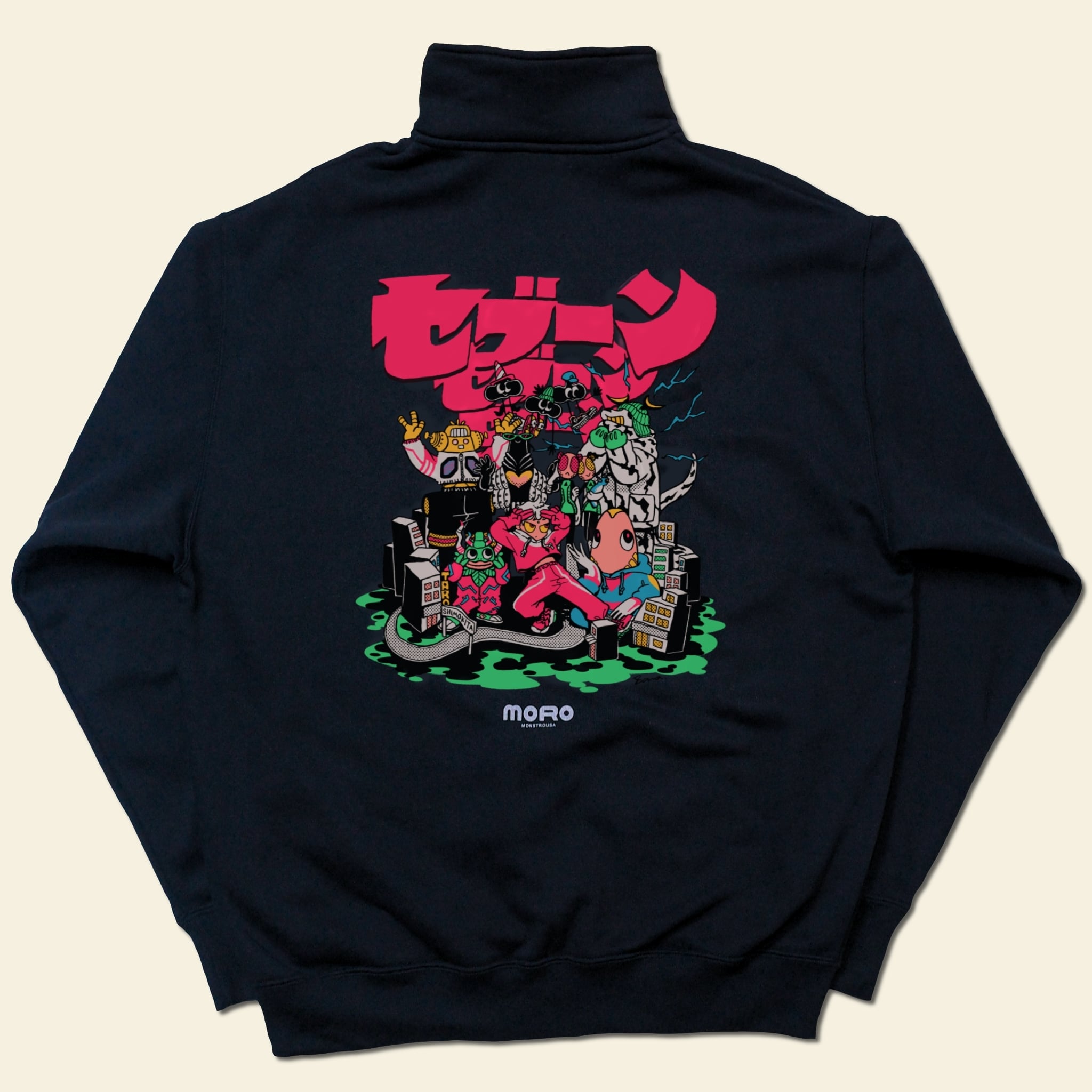もっちりとした柔らかく厚手な生地感のハーフジップの背面に、ウルトラセブンのキャラクターを施しました。フロントの印象的なワンポイント刺繍はどこか既視感のある位置どりです。肌寒い季節のデイリーユースに適した1着です。