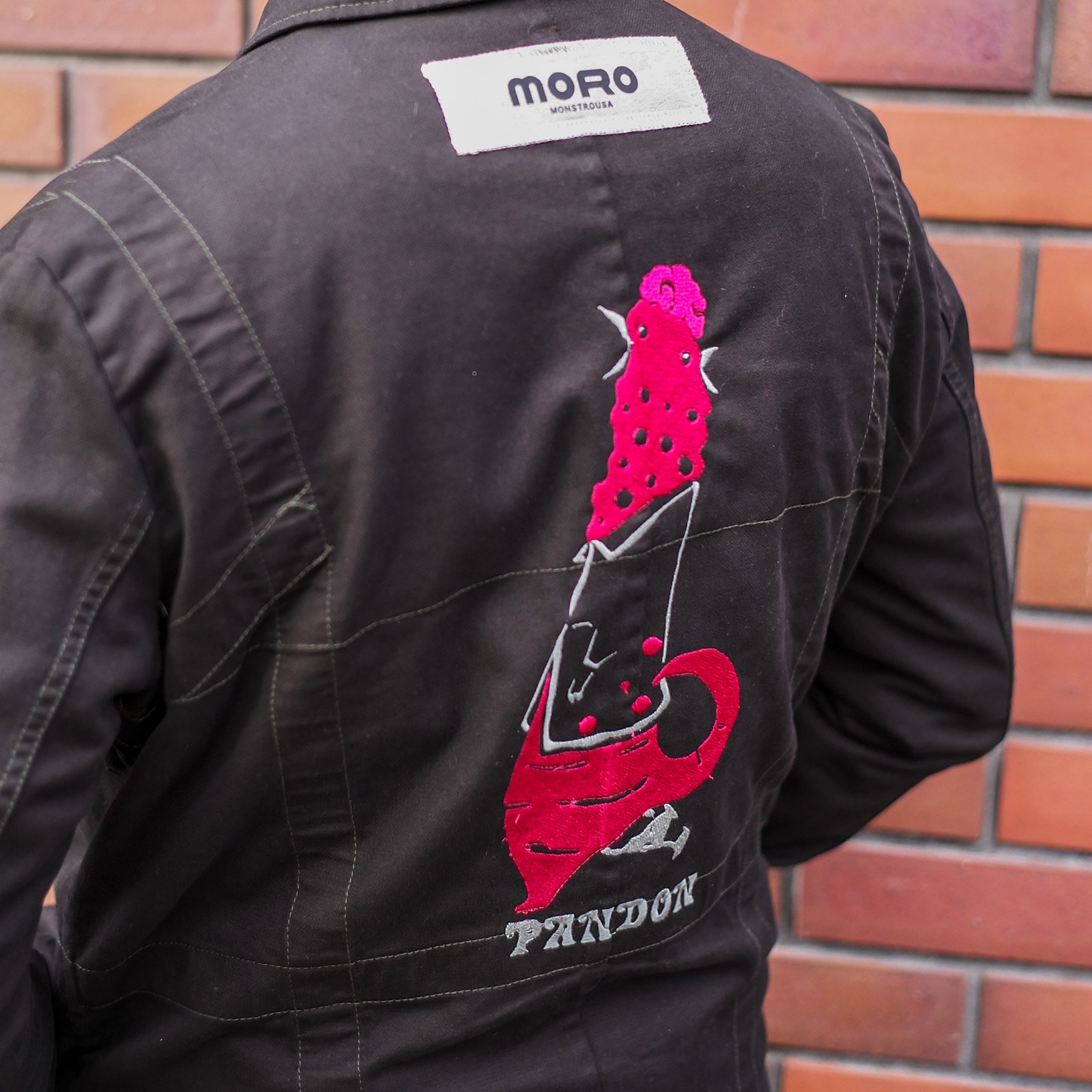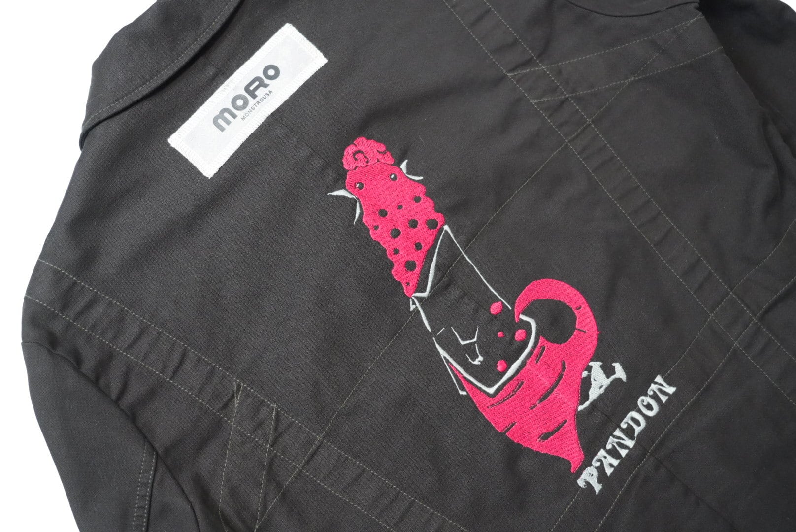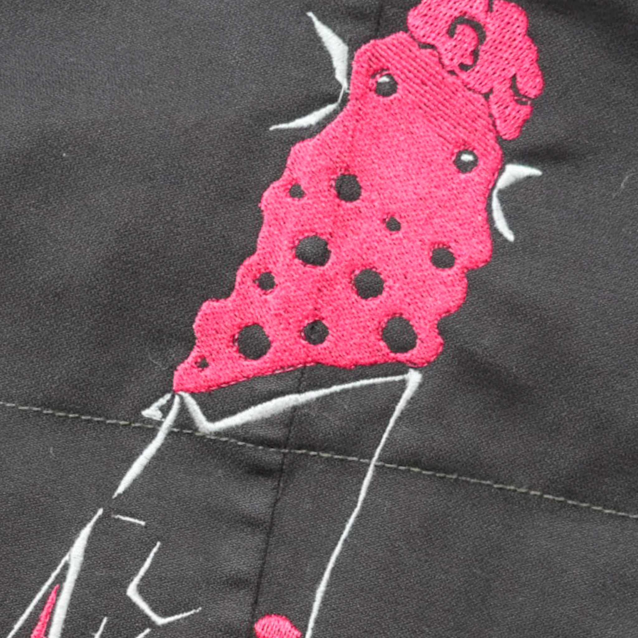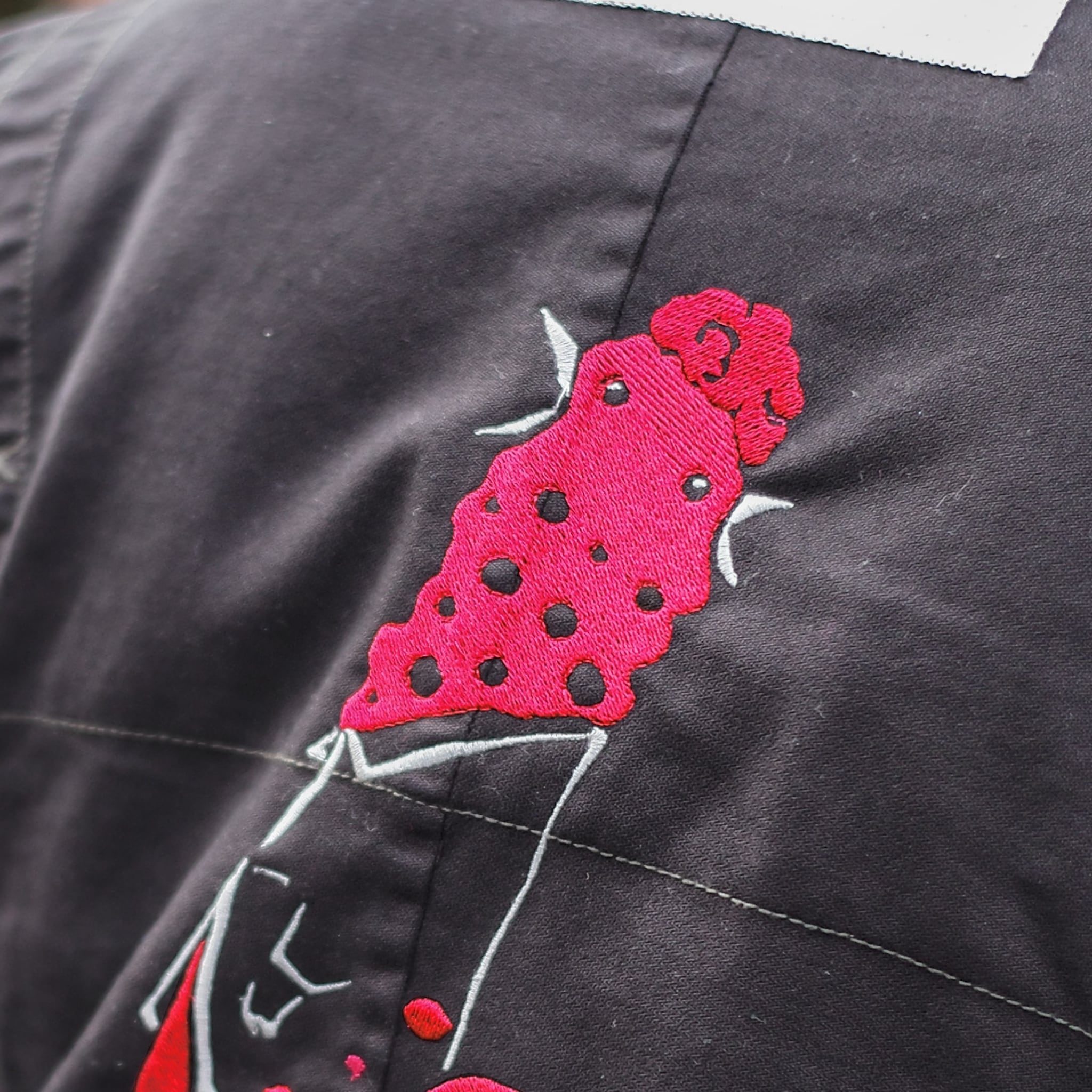 フロントのジッパーデザインが魅力的なブルゾンに、ウルトラセブンシリーズきっての人気強敵"パンドン"のアートを刺繍しました。ベース服のステッチ糸の色と刺繍糸の色を合わせることで馴染みがよく仕上がりました。