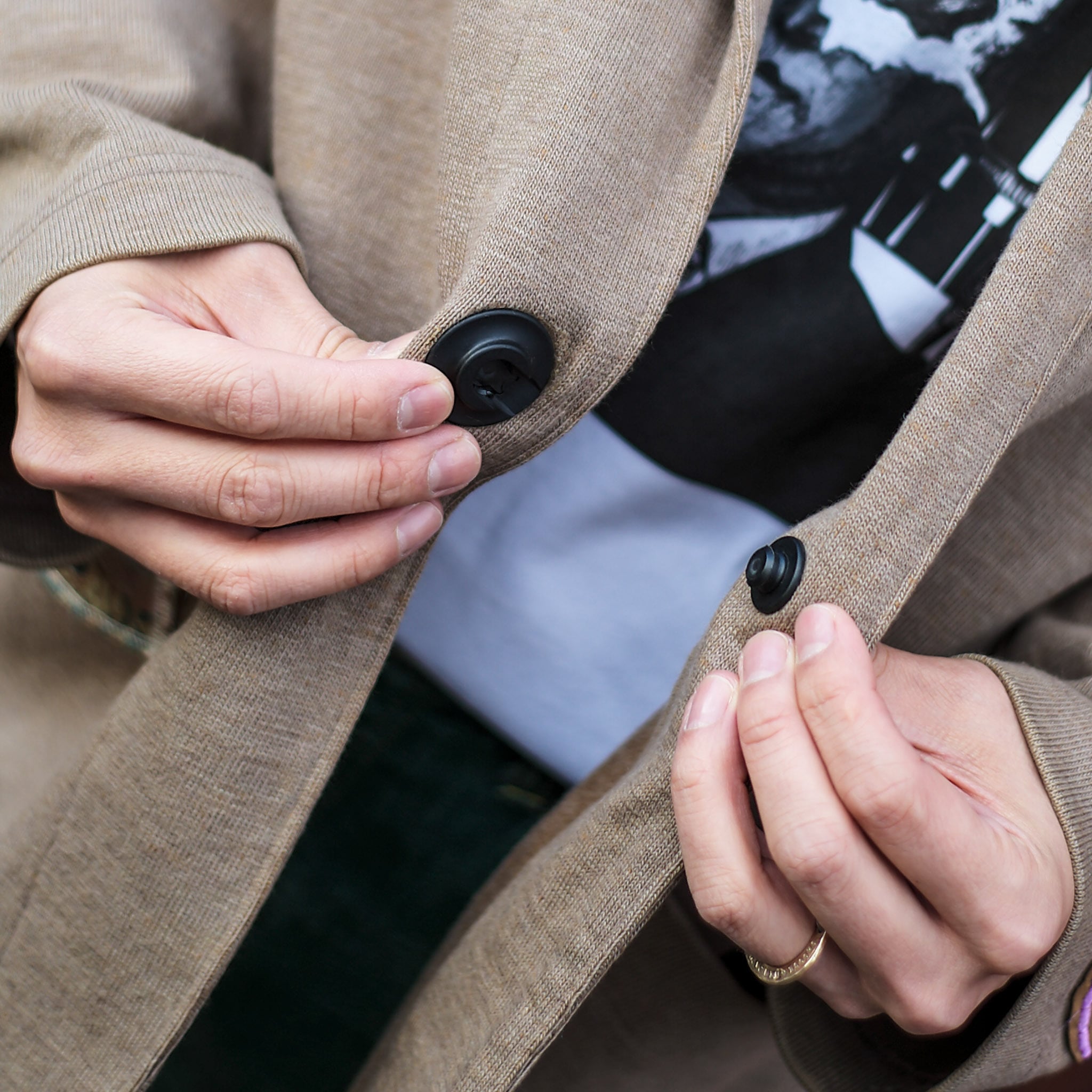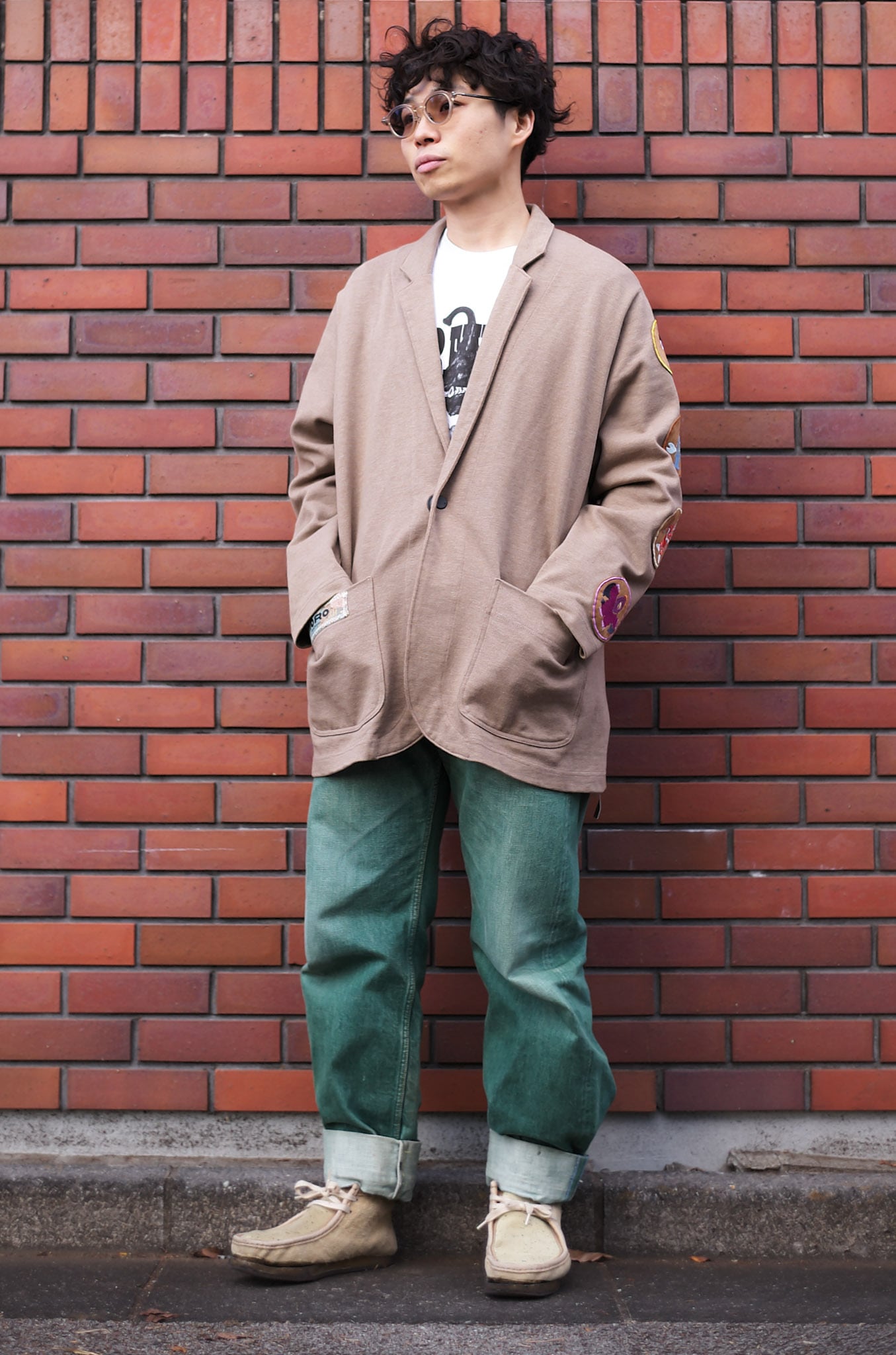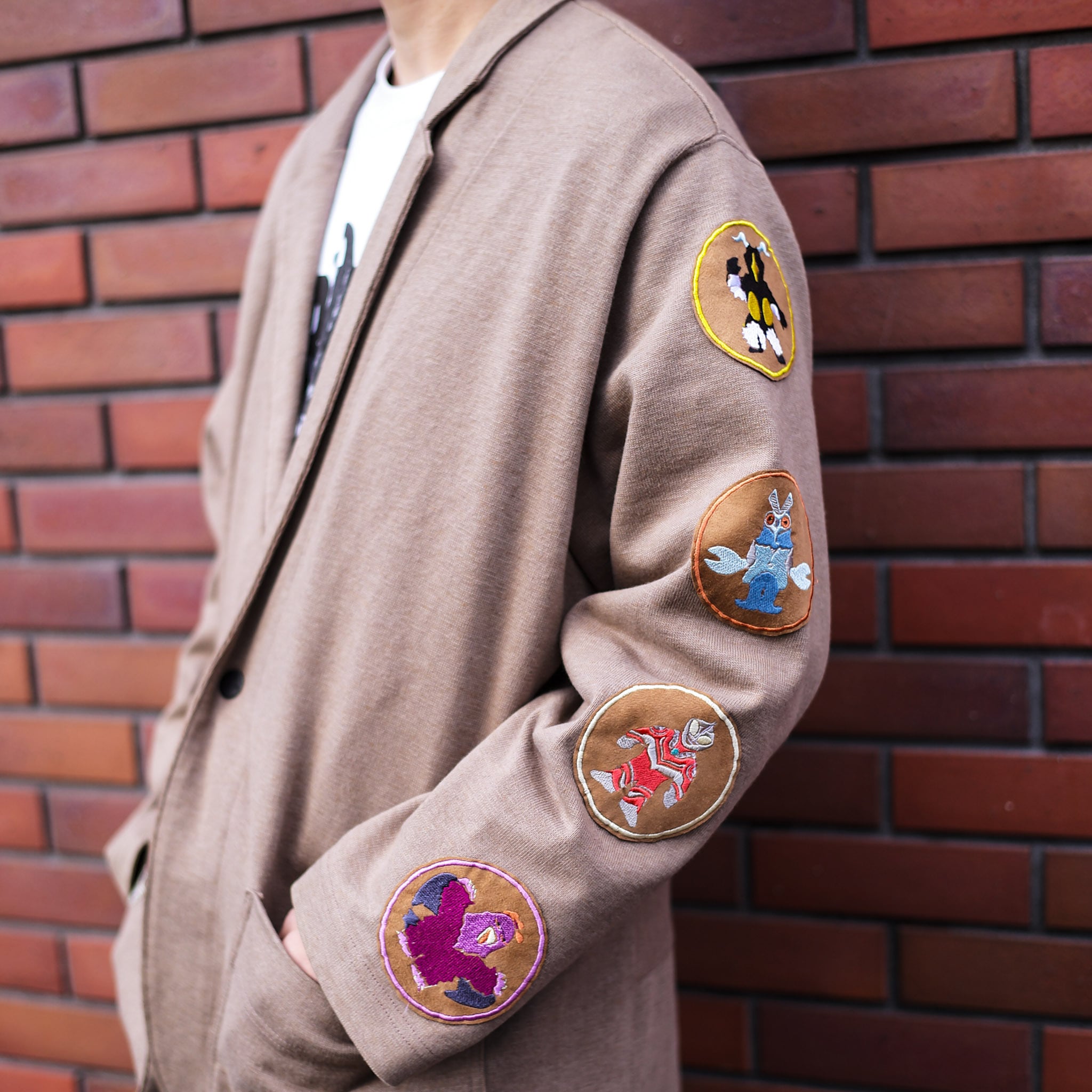 着心地の良い柔らかな素材のベージュジャケットはルーズシルエットでラグジュアルな雰囲気を演出します。袖に施された4種の刺繍ワッペンはどれも衣装に使用された一点物の生地をベースにした特別なアイテムです。絶妙なサイジングやフロントの磁石ボタンなどこだわりの詰まった1着です。