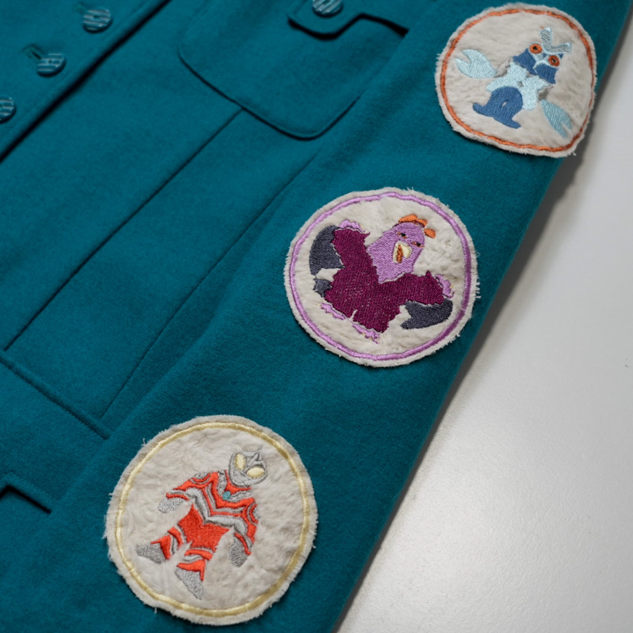 鮮やかなショートコートはボタンのデザインが非常に特徴的な1着です。流行に左右されない普遍的なデザインは、年代物特有の魅力。かつ状態も良く発色の良い、遊び心に満ちたベースウェア。そこにショートファーの刺繍ワッペンを施したこの服は、唯一無二の鮮やかさを放ちます。