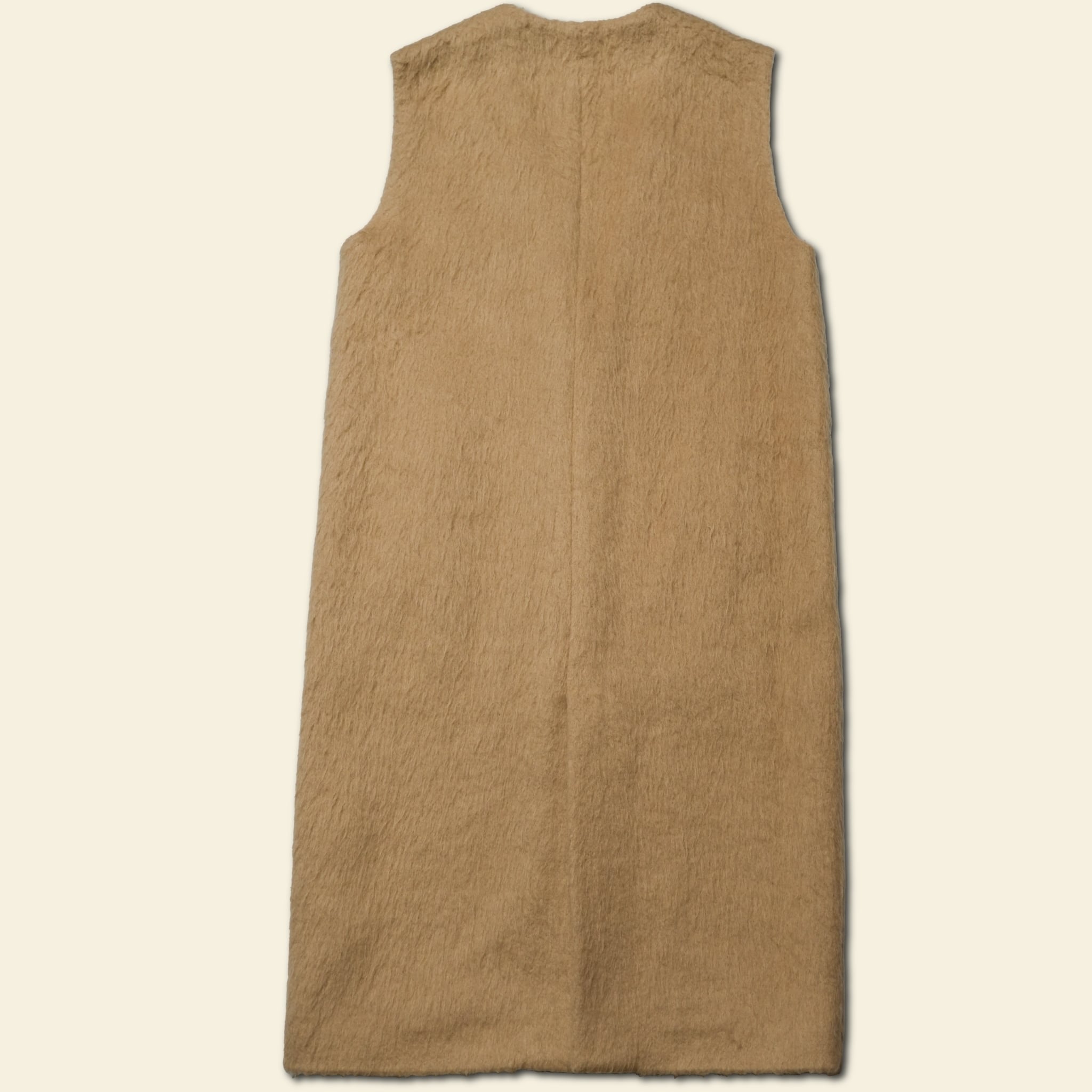 短く起毛したファーのノースリーブコートはコーディネートに幅を与える1着です。人気アーティストのumao氏が描いたアイコニックなゾフィーの刺繍アートワッペンは、土台にファー素材の生地を起用。同色同系素材が合わさった遊び心を楽しめます。ポケット口のArt TAGも愛着を沸かせるポイントです。