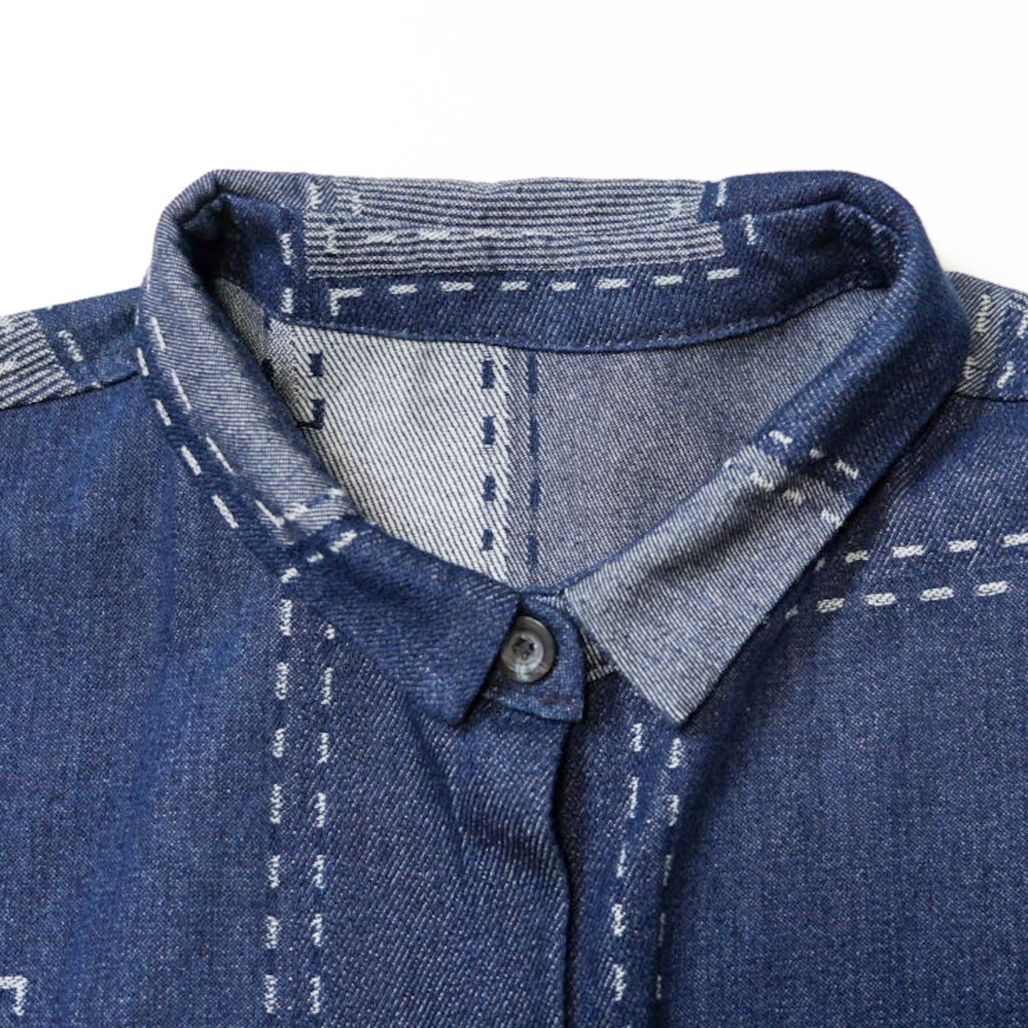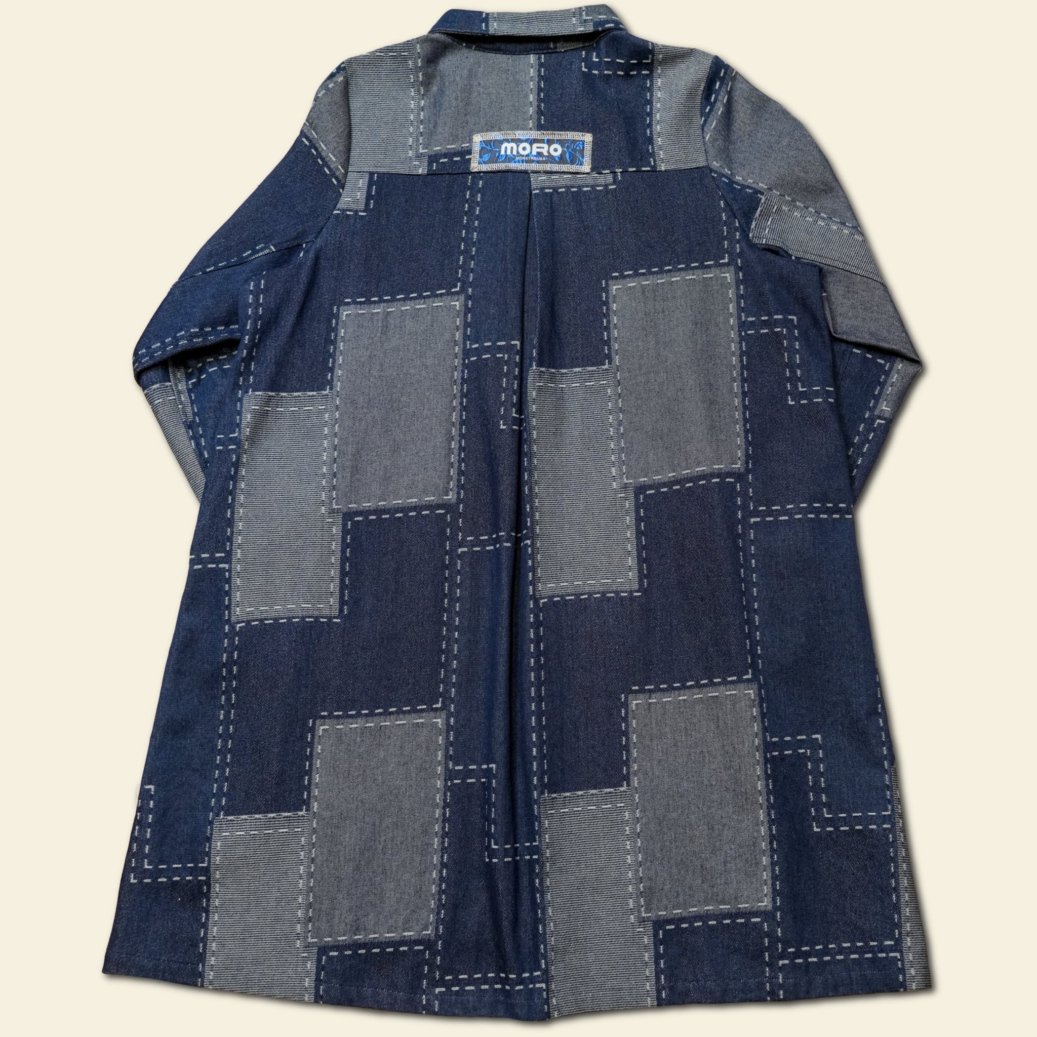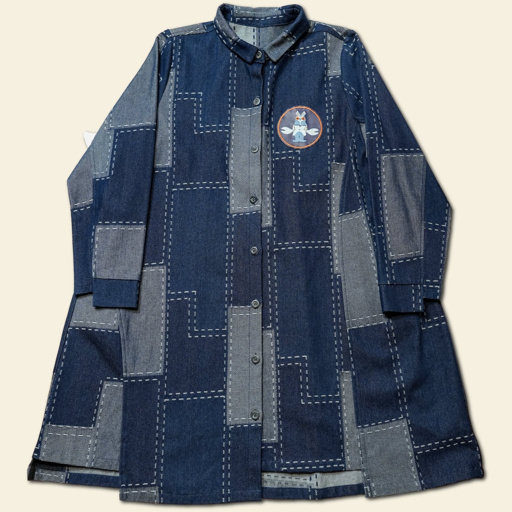 ファクトリー感のあるツギハギ柄と、"和"を感じる刺し子のデザインが特徴の生地を使用したライトコートです。胸元に刺繍バルタン星人のワッペンをほどこし、背面には色合わせの効いたArt TAGを縫い付けました。背中心の大きなタックがフレアシルエットを際立たせます。加工はシンプルですが、ベース服のデザイン性が光る1着は幅広いシーズンで着用が可能です。