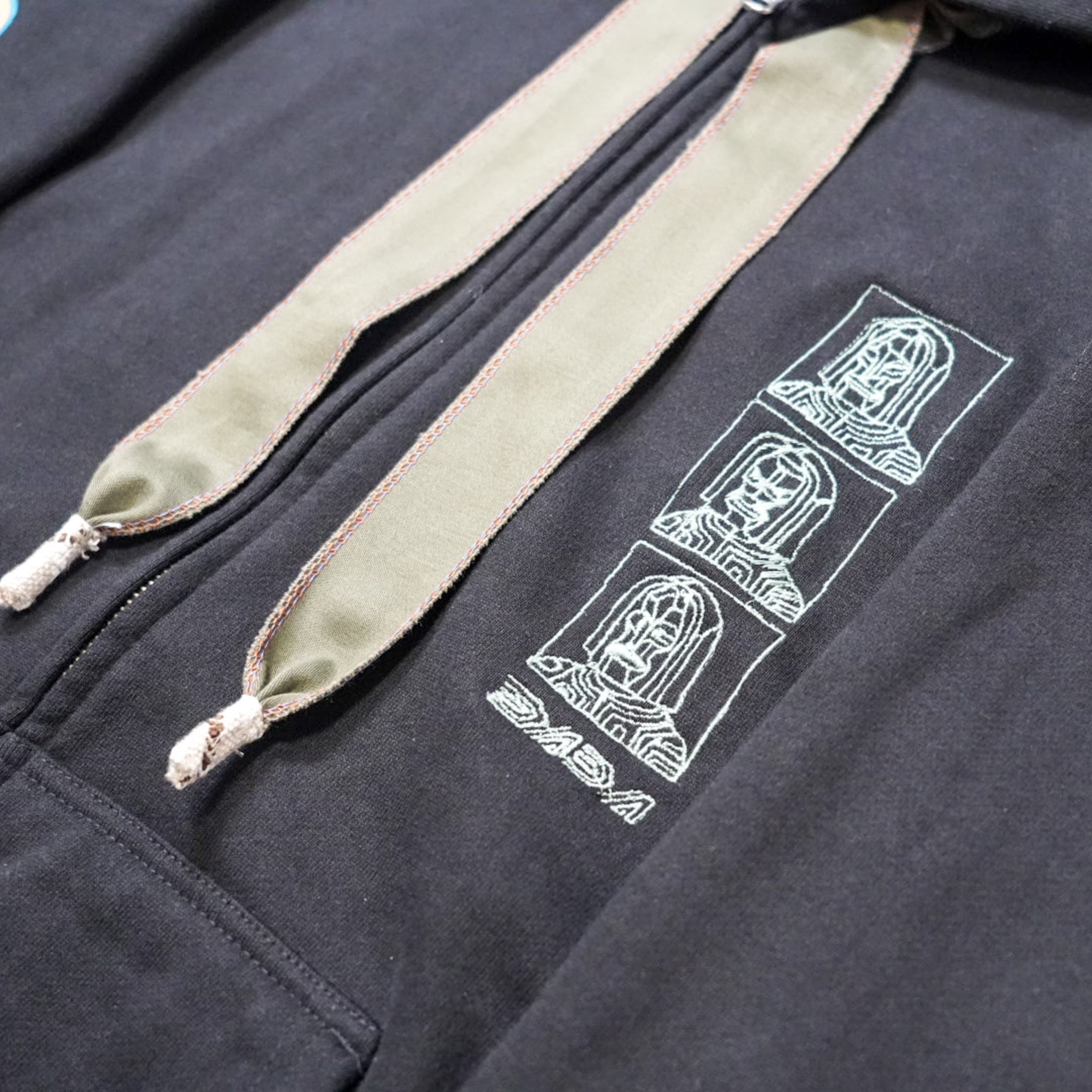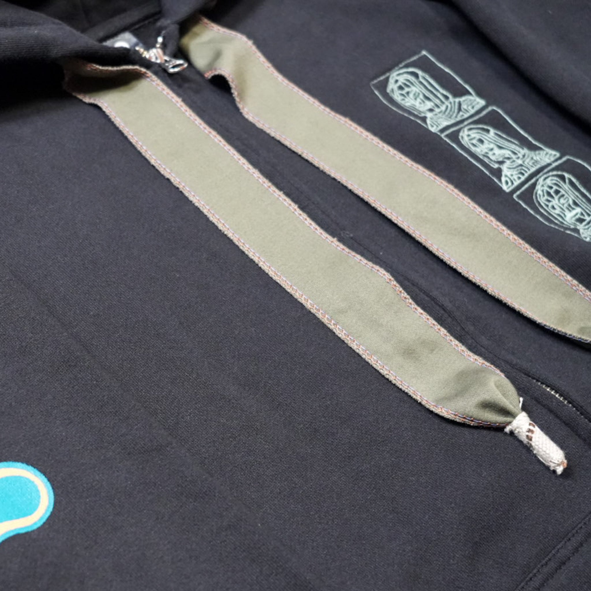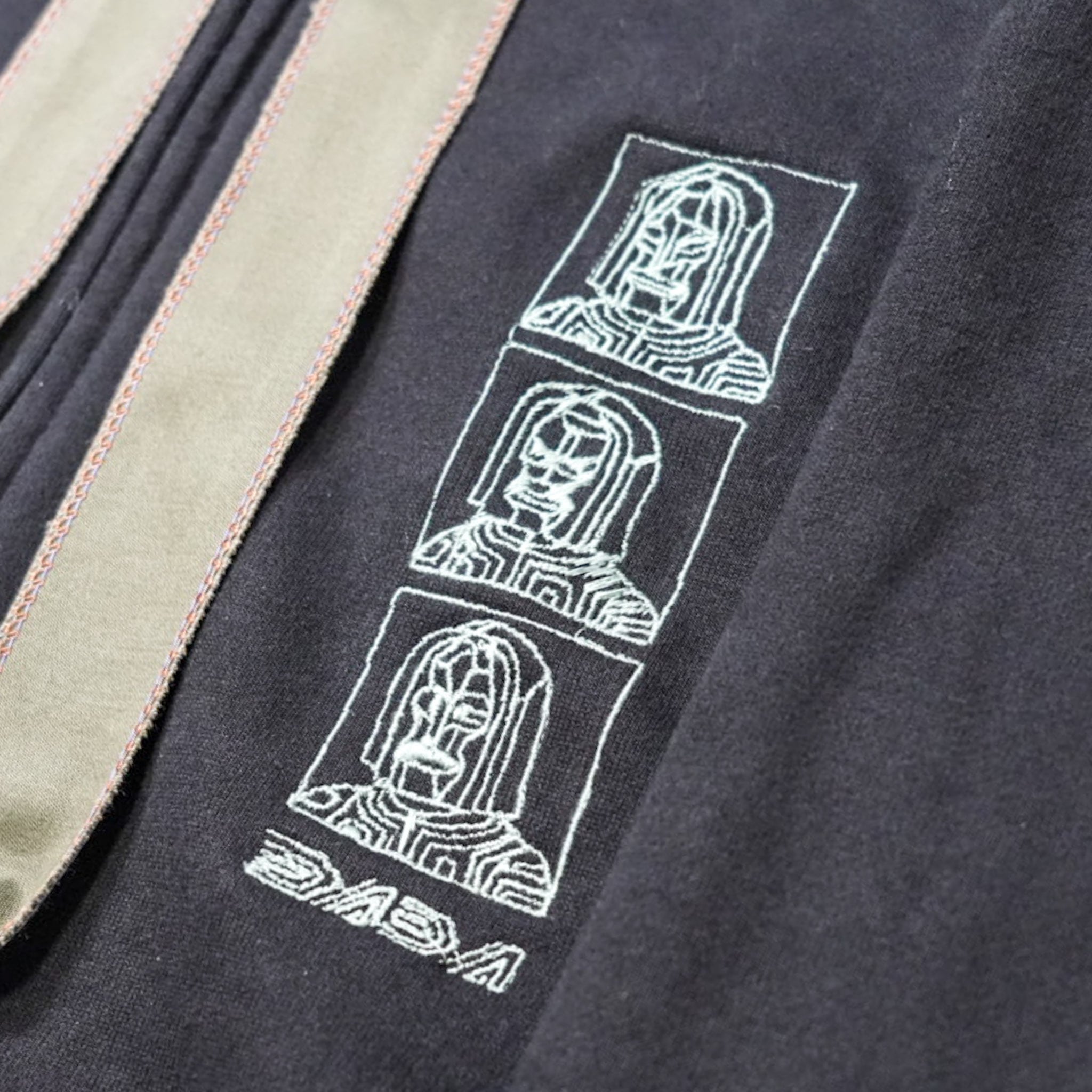 MONSTROUSAのオリジナルアイテムArt TAPE Hoodieをベースに、三面怪人ダダのアートを刺繍しました。職人が手作りで仕上げた一点物のテープは唯一無二の存在感を演出し、馴染みの良い糸色で刺繍されたポリゴン化されたダダのアートが魅力的です。