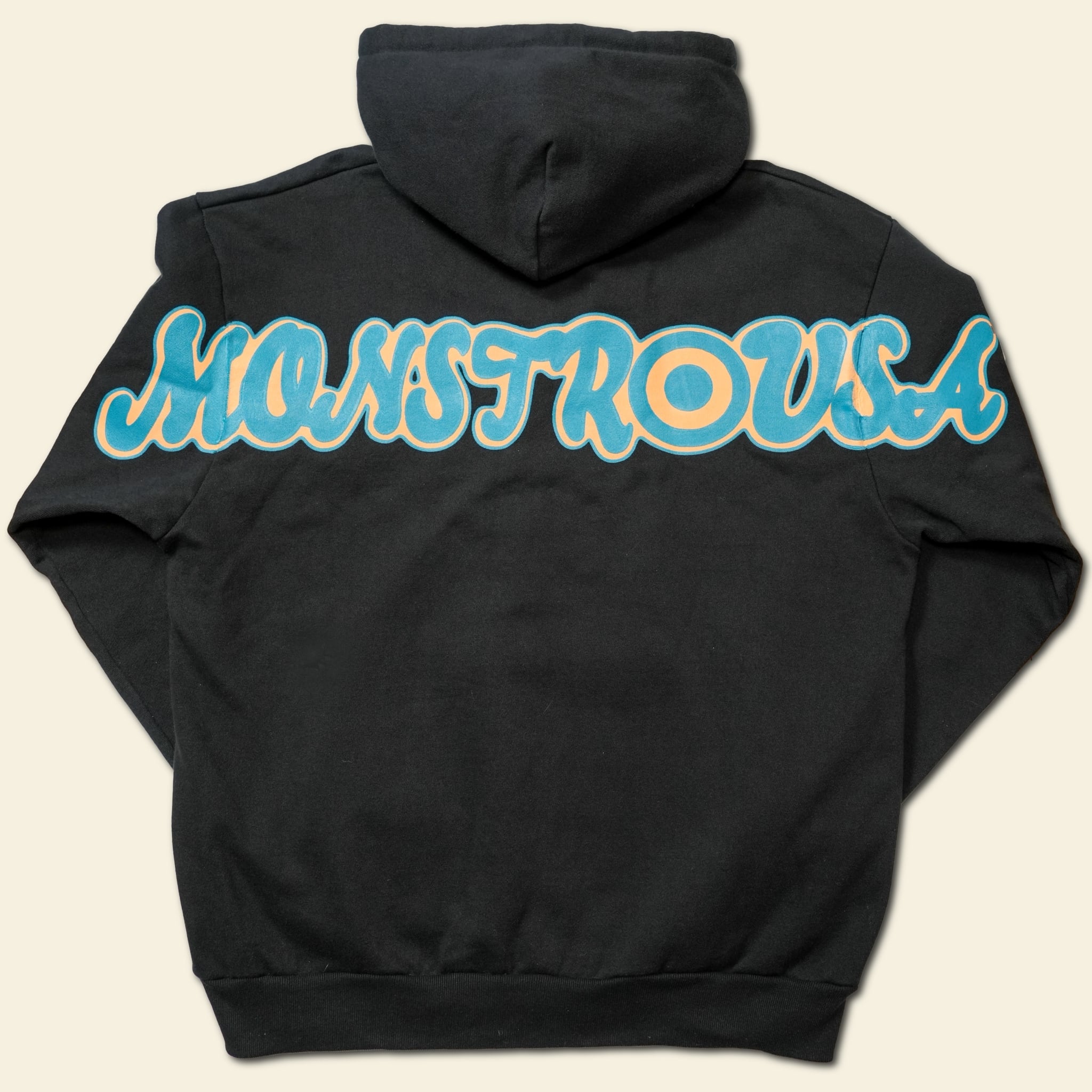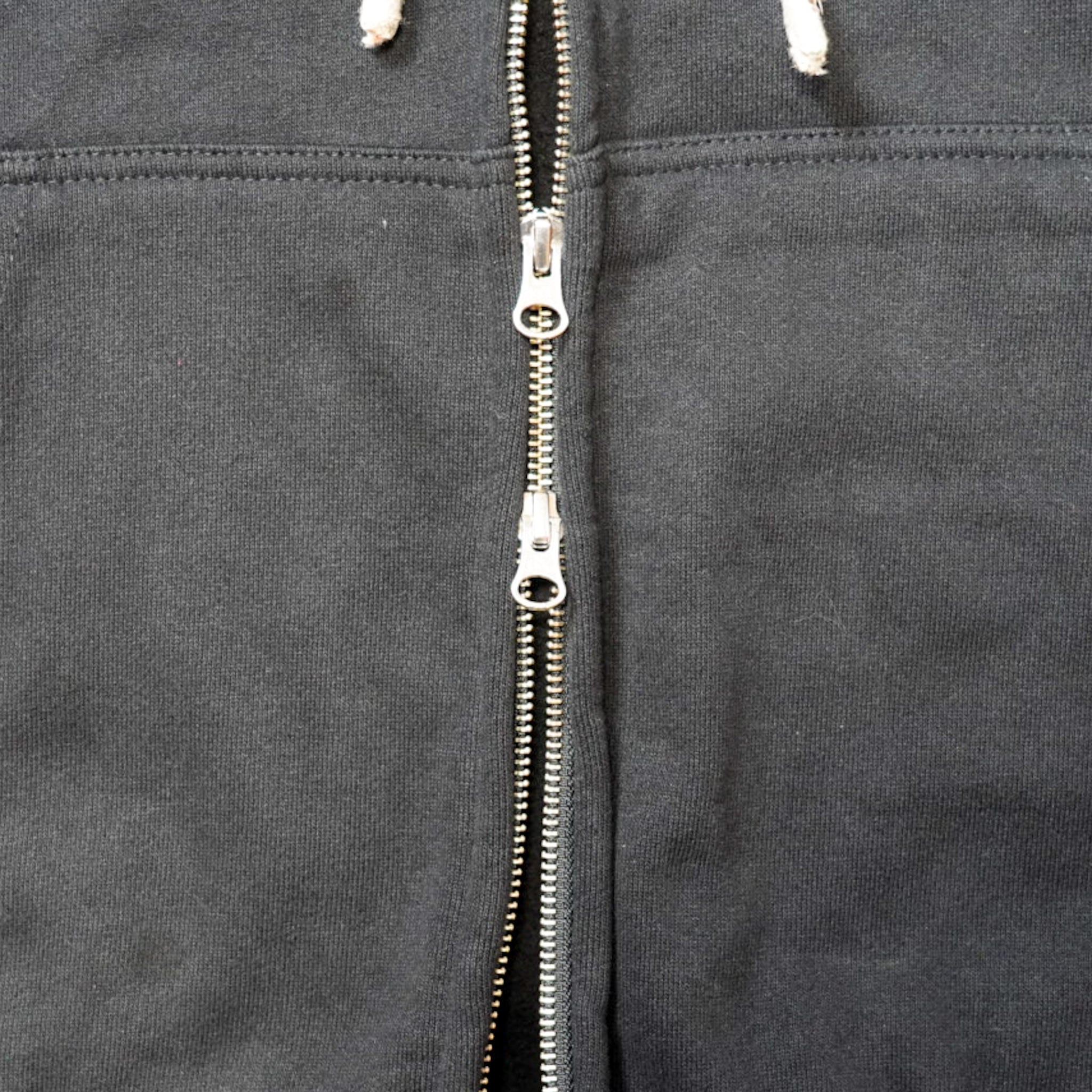 15onzの極厚生地に加え、裏起毛のジップアップパーカーは肌寒い季節に重宝するアイテムです。シンプルな黒パーカーの背面に身幅を超える超インパクトのアートを施しました。ブランドコンセプトの「OVER MADE」を象徴する大胆なデザインです。