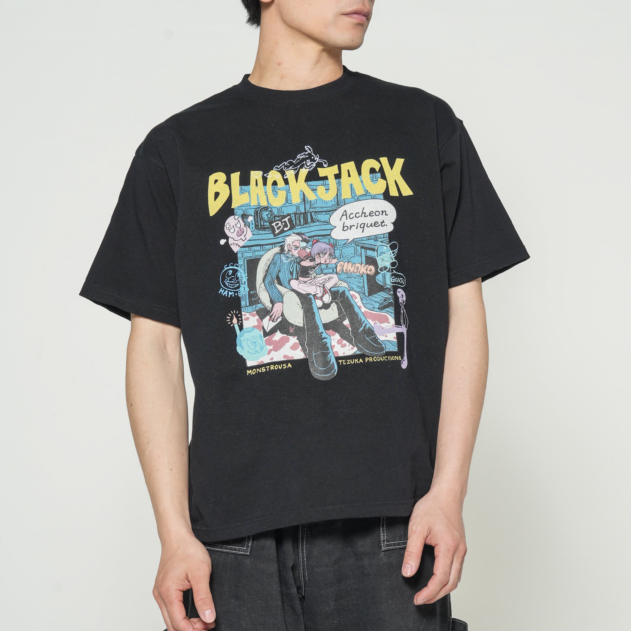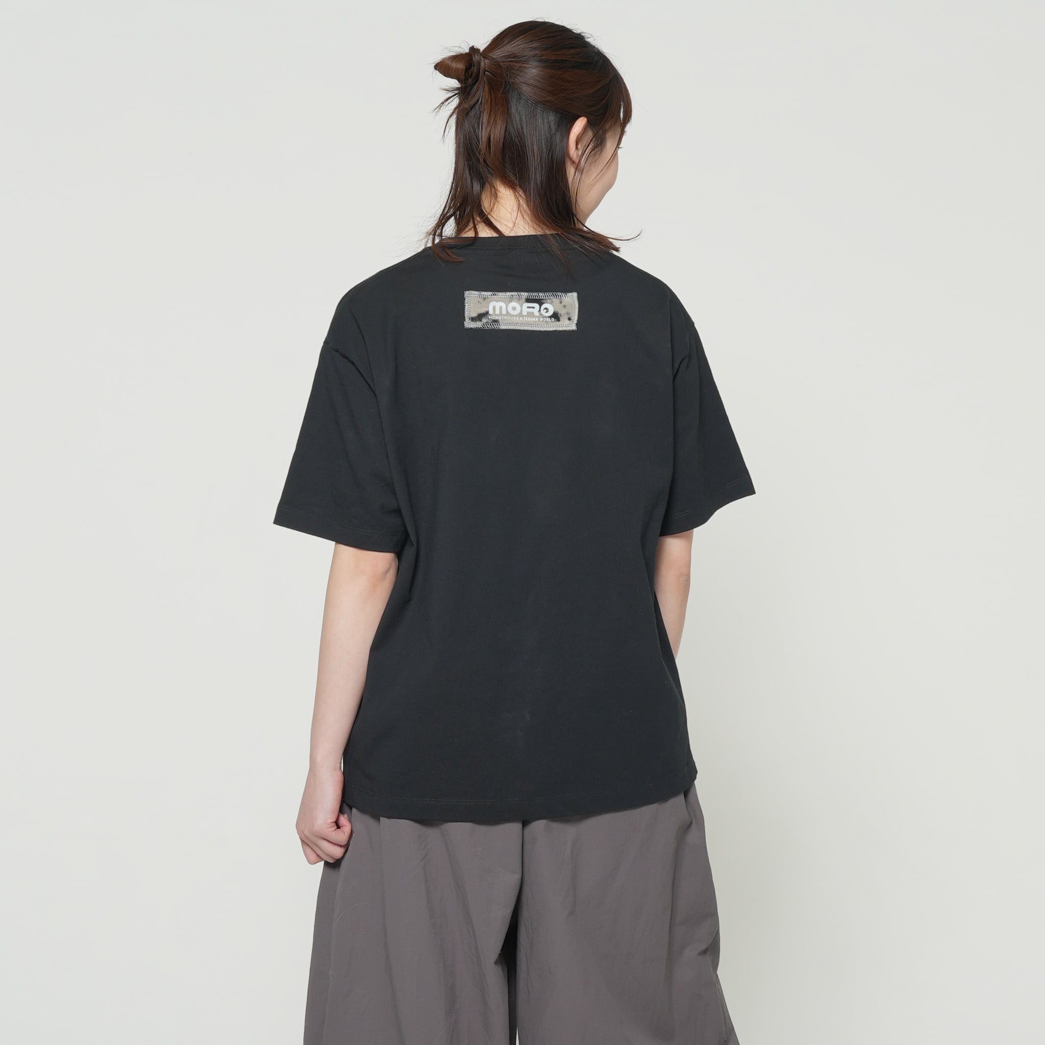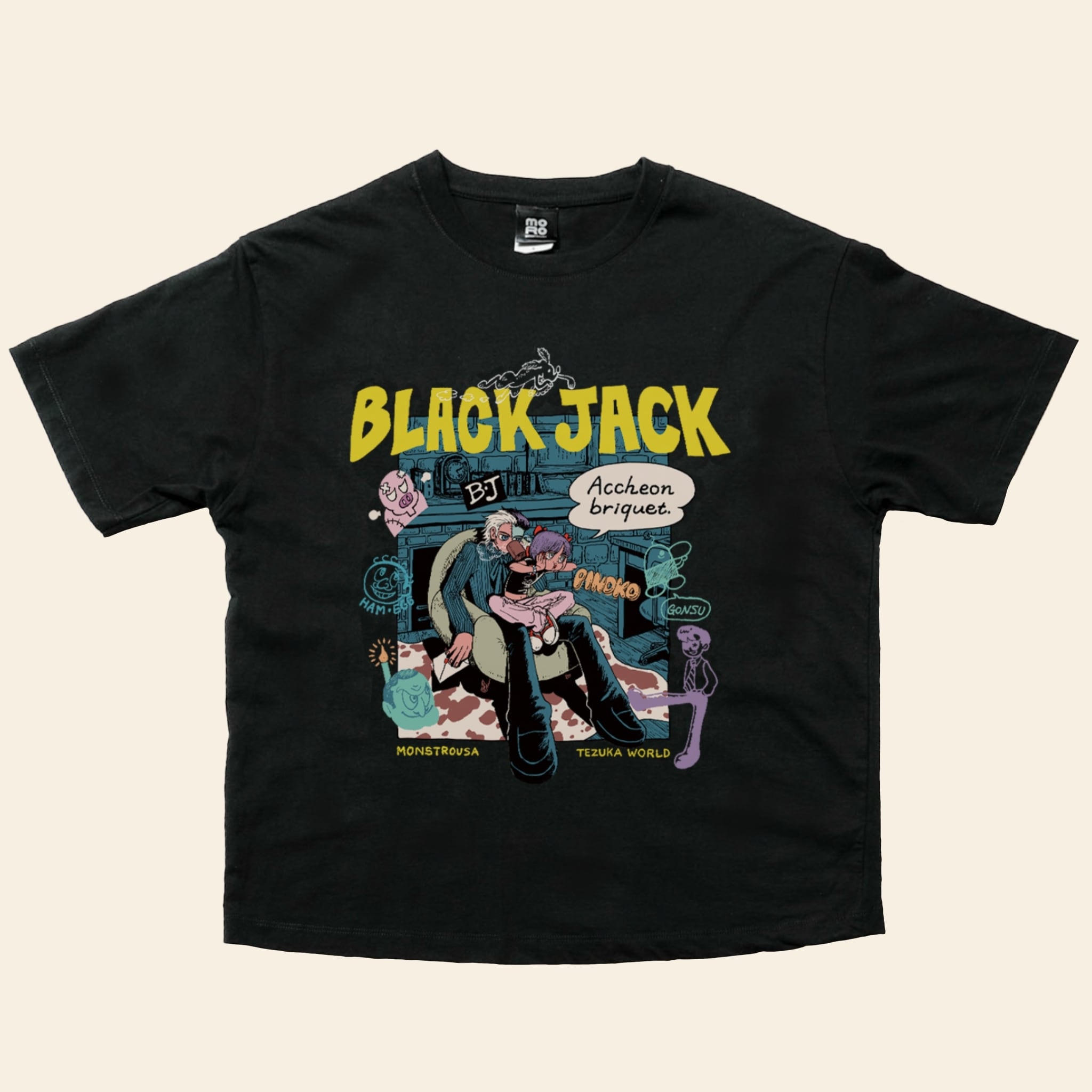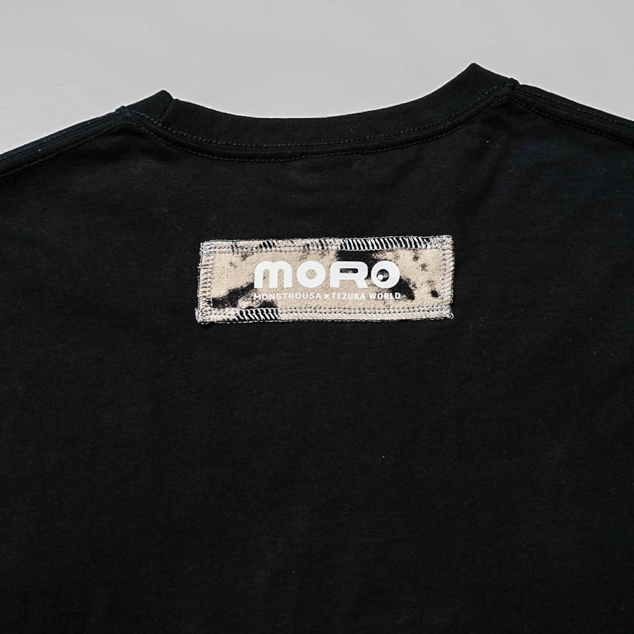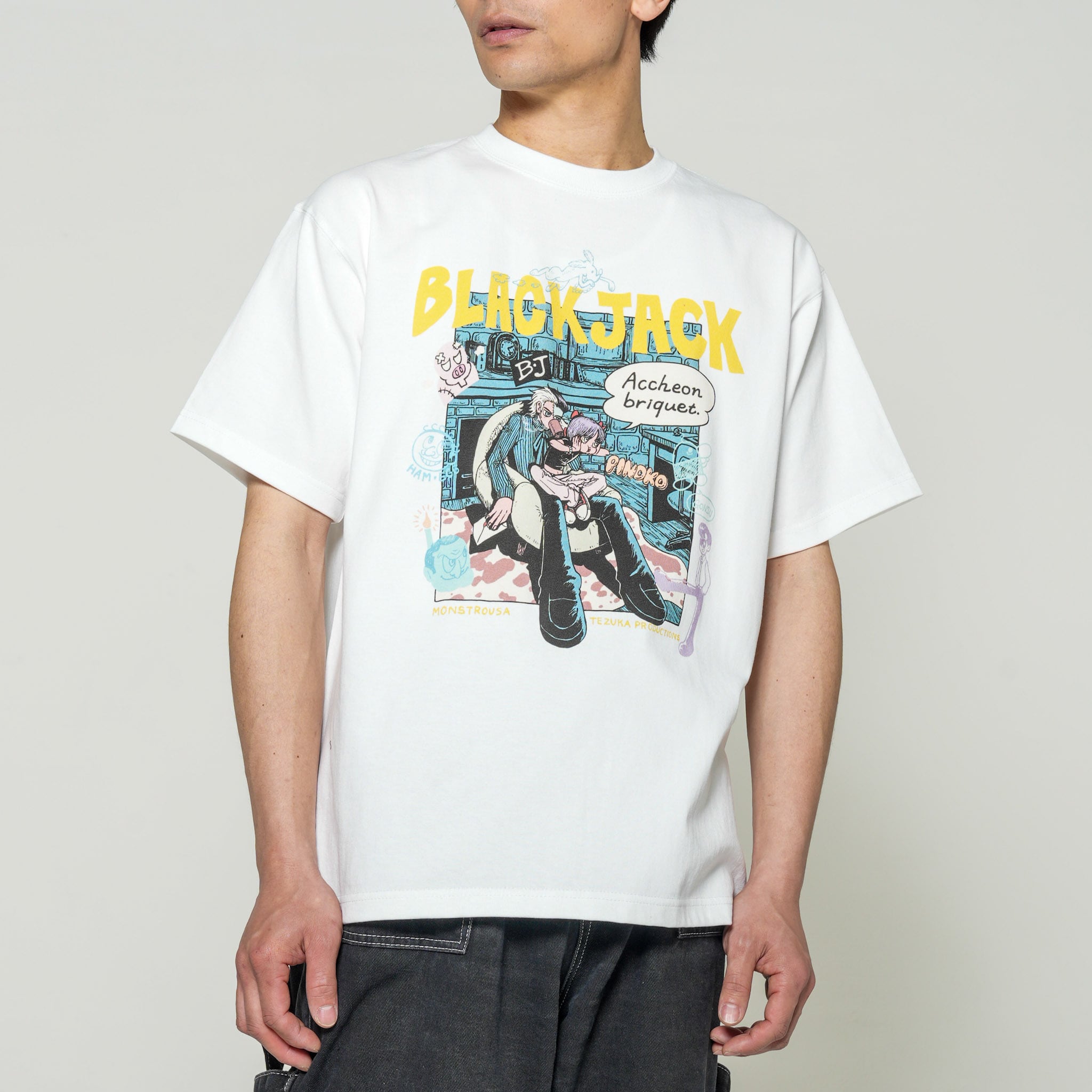 フロントに大きくプリントされたKANA SUZUKIの「BLACK JACK」アートは、現代アーティスト兼漫画家として真正面から手塚治虫の金字塔に向き合った傑作です。関係性が浮かび上がるような二人の周りには、落書きのようなタッチでキャラクターが散りばめてあり、1つのアートで作品全体を楽しめるような構成です。衣裳屋ブランドならではのこだわりが込められた背面のM/TAGは、所有欲を満たすアートピースです。