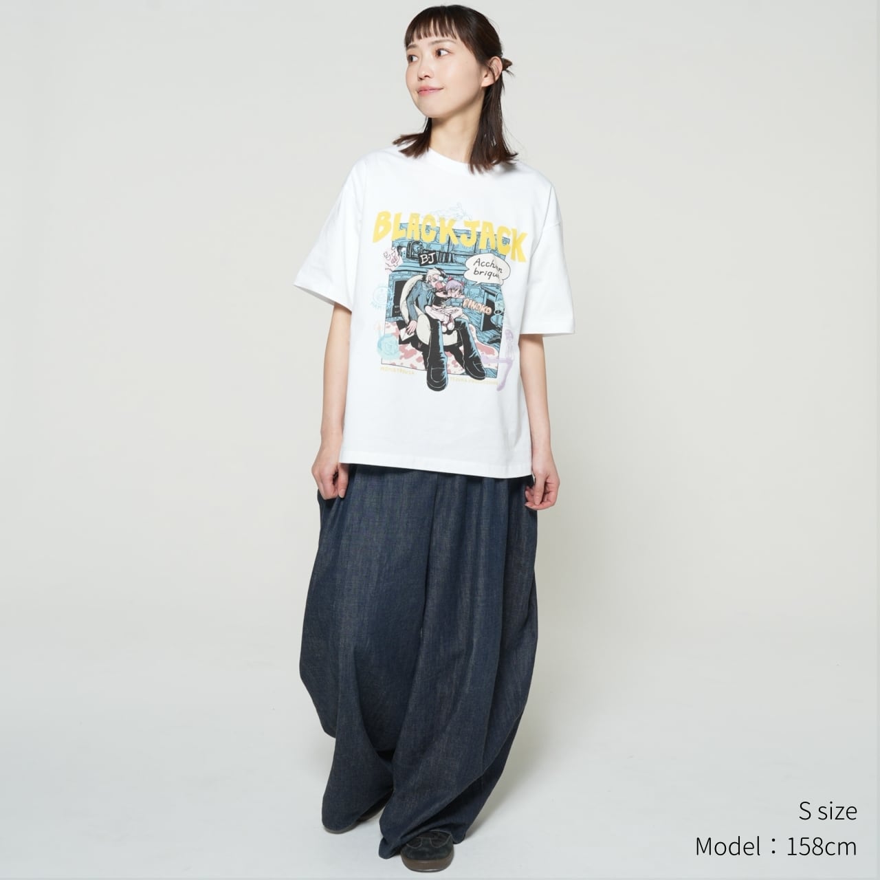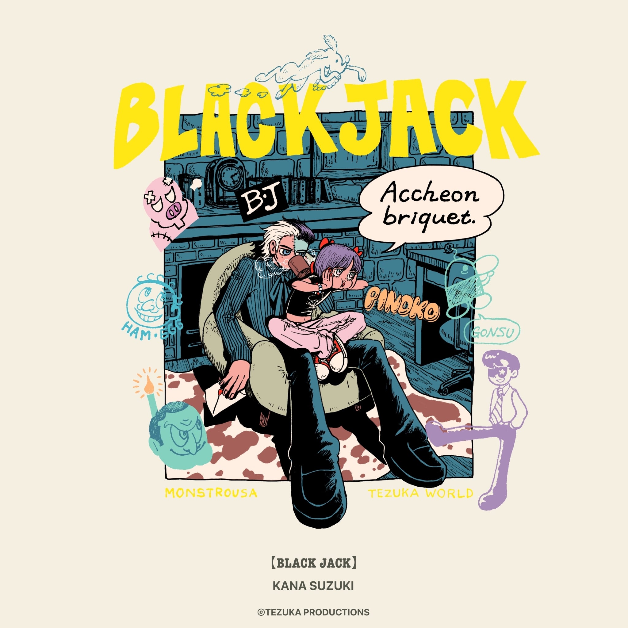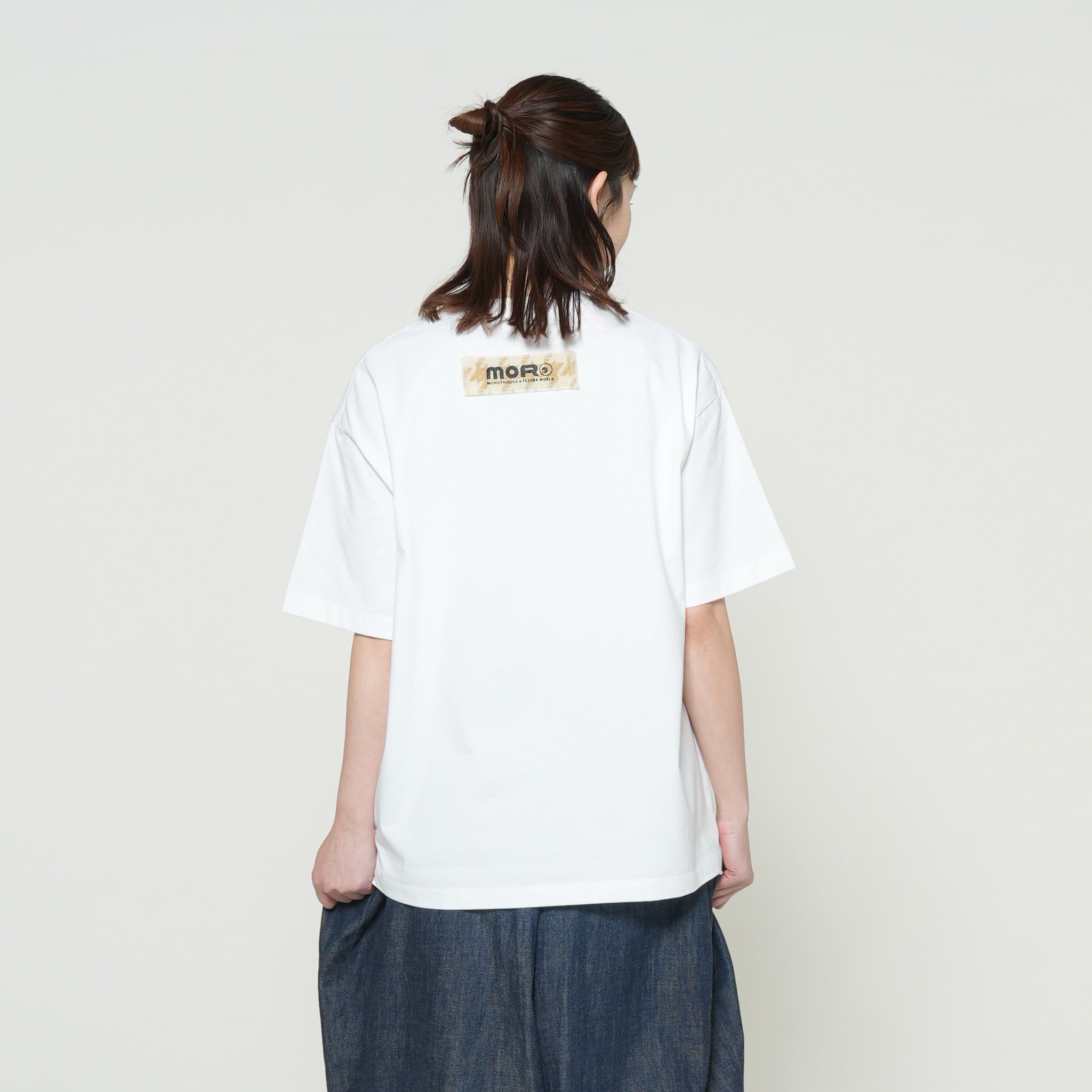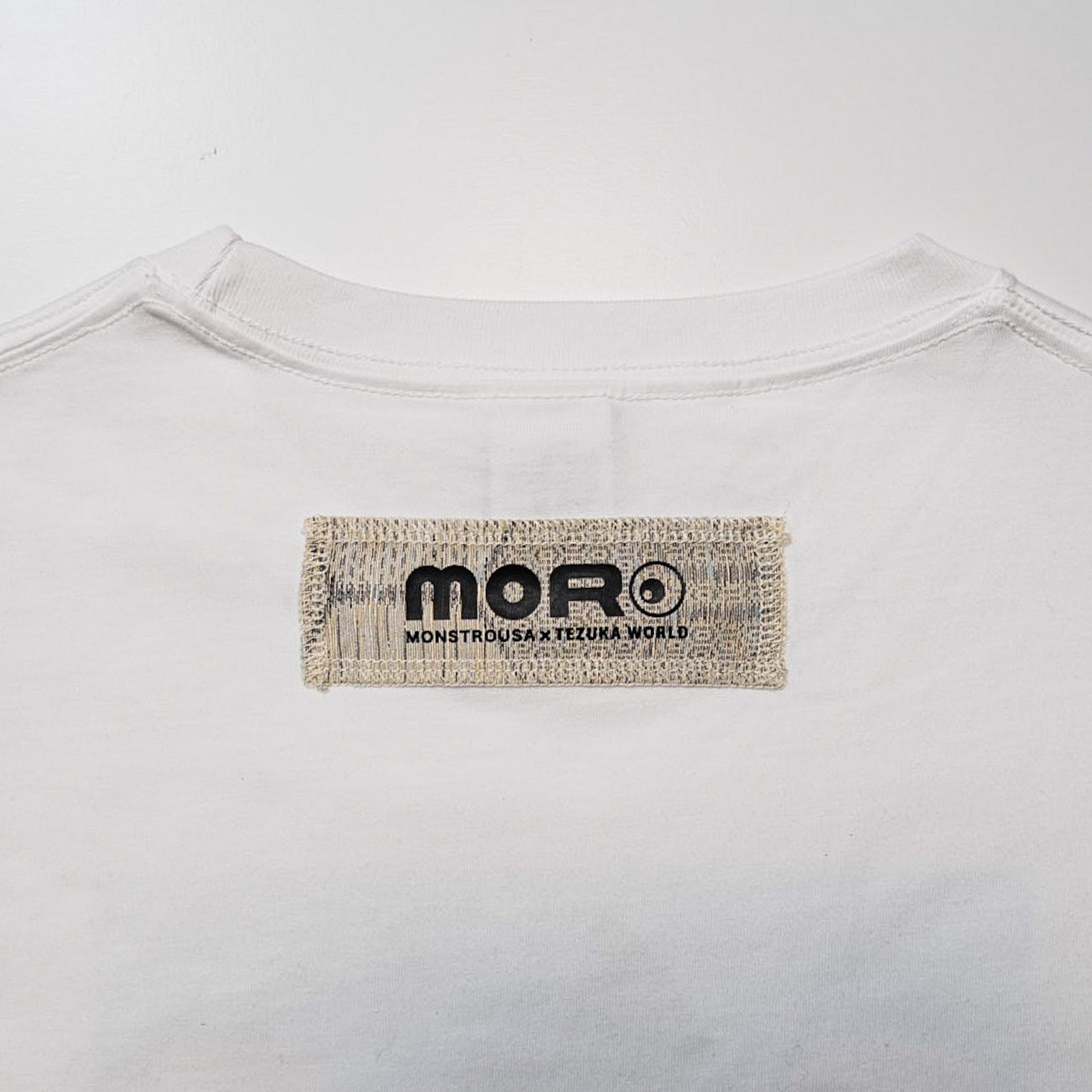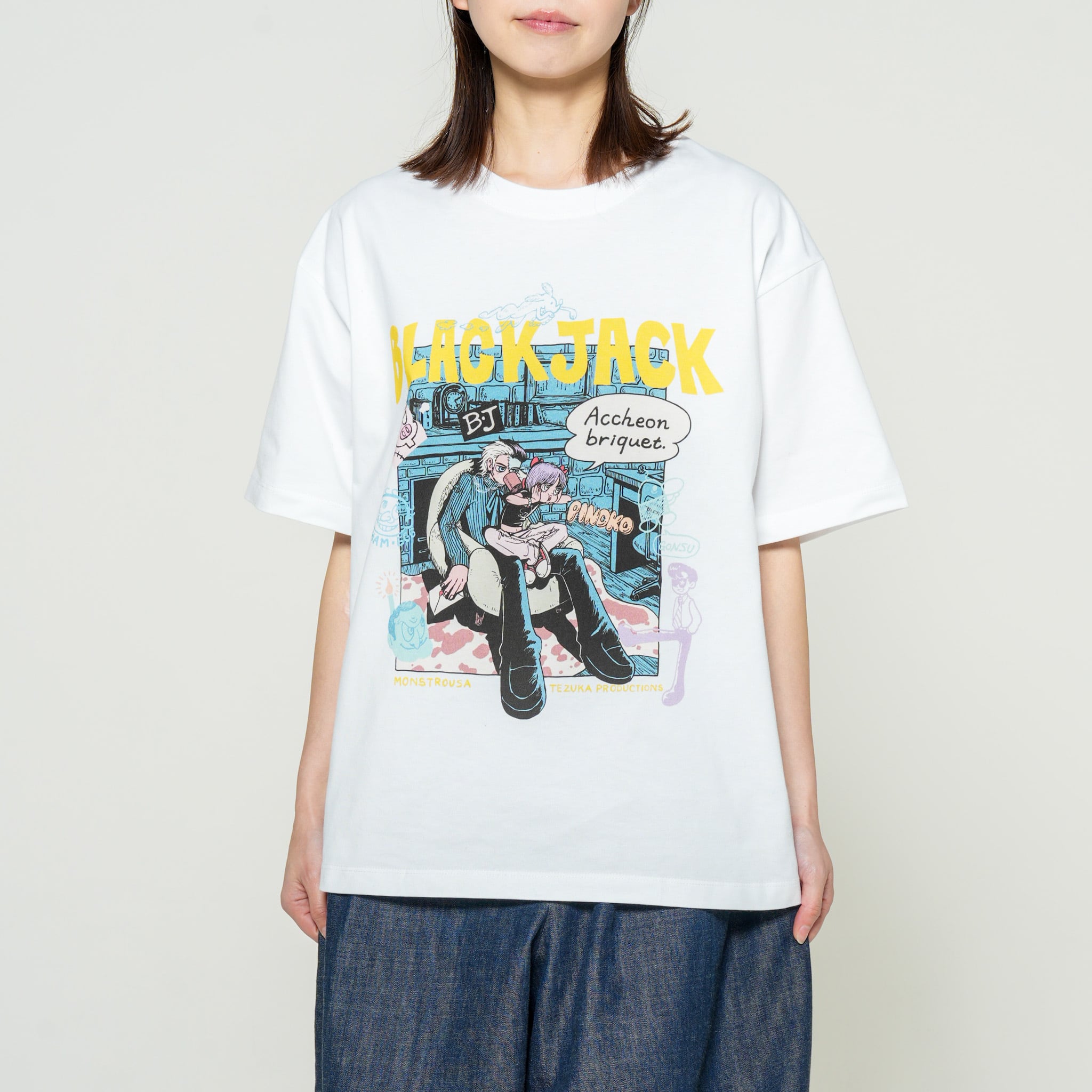 フロントに大きくプリントされたKANA SUZUKIの「BLACK JACK」アートは、現代アーティスト兼漫画家として真正面から手塚治虫の金字塔に向き合った傑作です。関係性が浮かび上がるような二人の周りには、落書きのようなタッチでキャラクターが散りばめてあり、1つのアートで作品全体を楽しめるような構成です。衣裳屋ブランドならではのこだわりが込められた背面のM/TAGは、所有欲を満たすアートピースです。