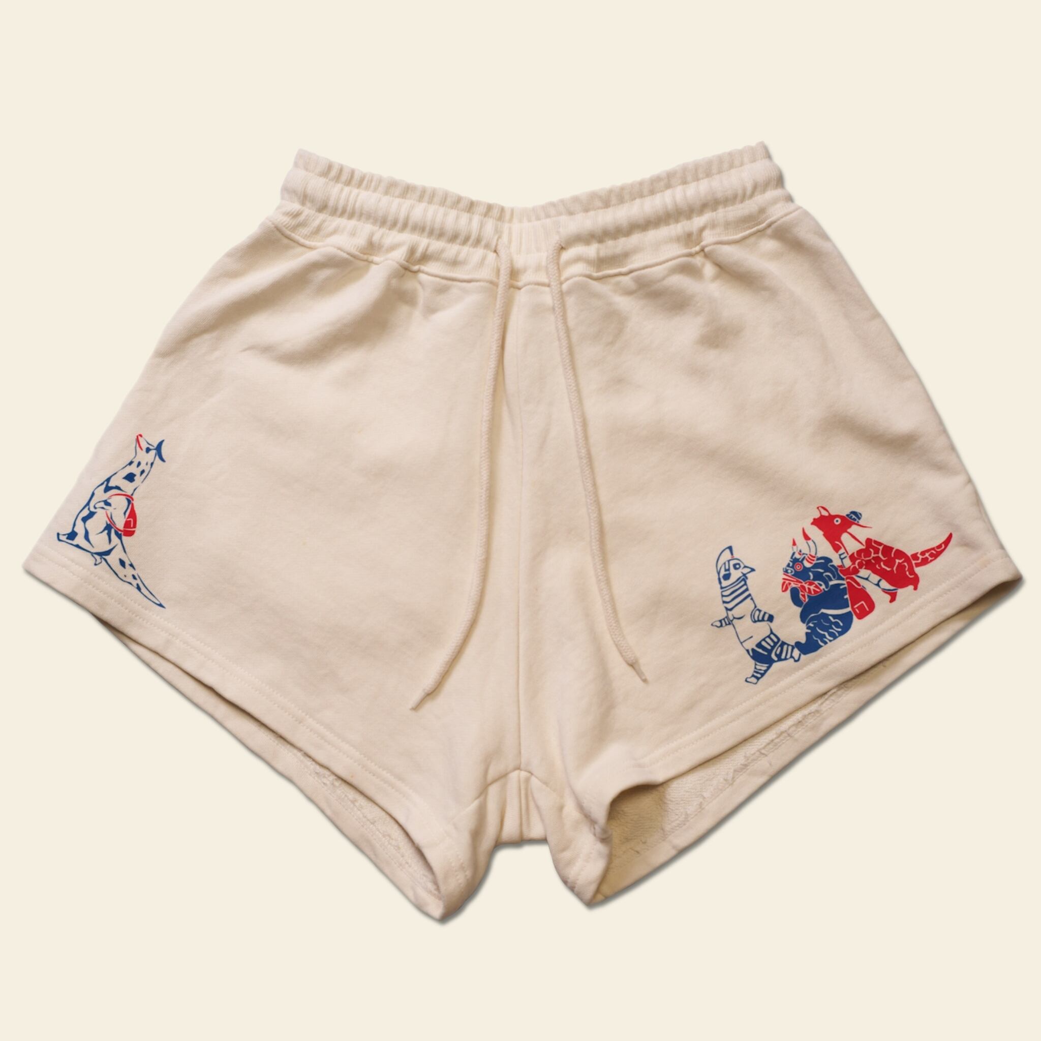 べージュのショートパンツに切り絵のような魅力をもつエレキングとカプセル怪獣のアートを施しました。丈の短さとスウェット素材の組み合わせが魅力の1着です。